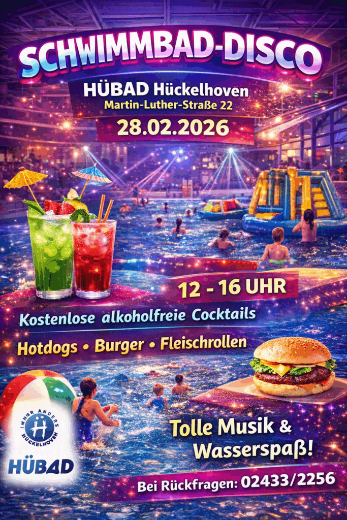 Die Schwimmbad-Disco 2026 findet am 28.02.2026 im HÜBAD statt.
